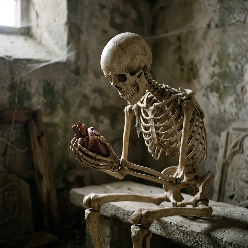A realistically depicted skeleton holding a human heart intimately, reflecting a sense of loss and longing as if it is holding onto a piece of its past life. The skeleton looks downward with an expression that suggests it has discovered something that it lost long ago.