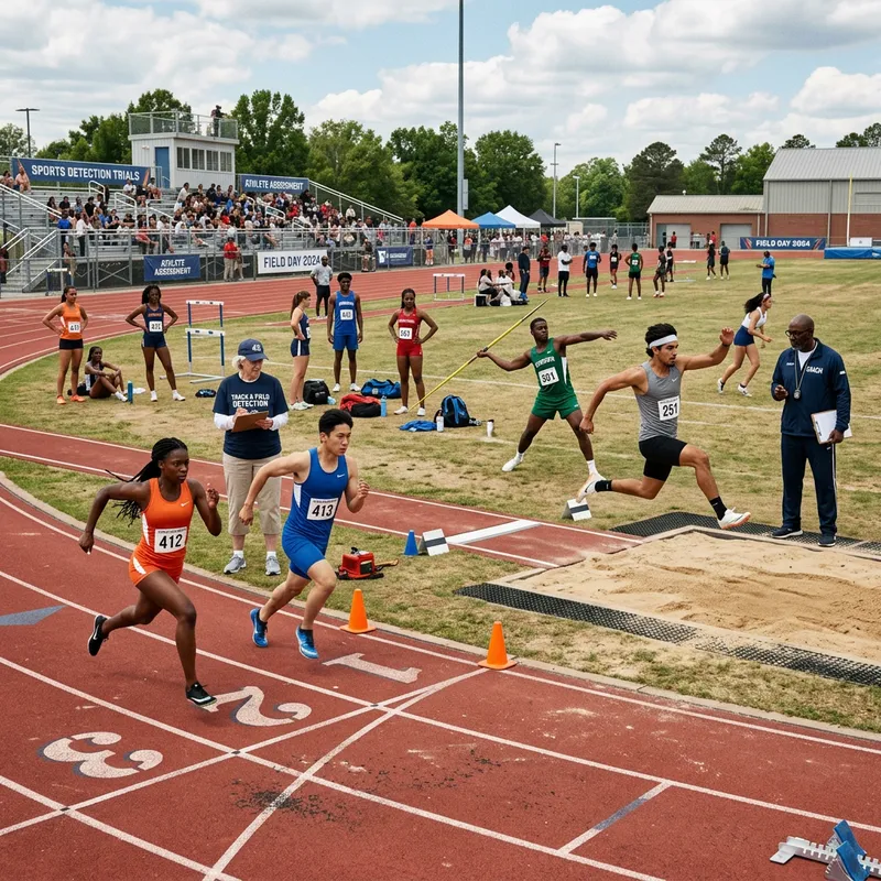Please create a realistic image depicting a sports detection event. The scene should take place on an outdoor field with clear dividing lines but a bit rough around the edges to imply lots of use. There should be athletes from various sports of diverse descents and genders. They could be engaged in various activities, like running, jumping, and throwing, showing off their abilities. The athletes could be outfitted in corresponding sports gear, and there should be coaches of diverse descents and genders assessing their performance.