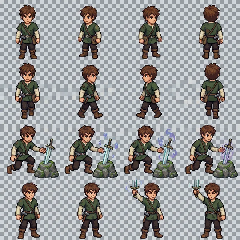 Create a 2D sprite of Kai/Kai, a young apprentice with the ability to discover swords imbued with the memories of their former owners.