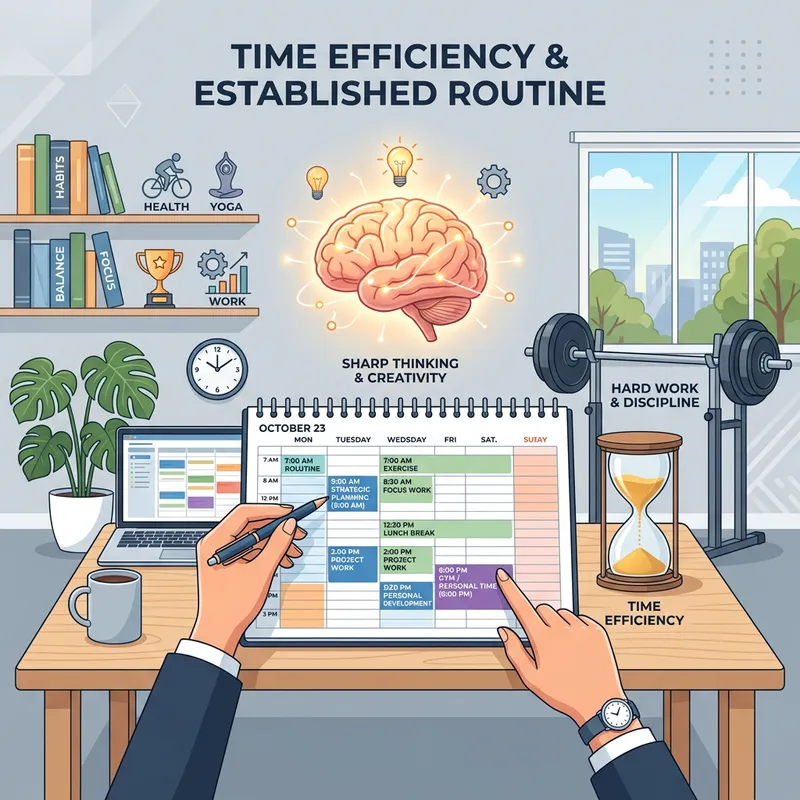 An illustration symbolizing the concepts of time efficiency and established routine. Showcase a minimalist professional workspace with elements like a calendar, an hourglass, a lifted barbell implying hard work, and a luminous brain denoting sharp thinking. Depict hands pointing towards specific time slots on the calendar denoting dedication and structure. Include a balance between work and personal activities, symbolizing the importance of work-life balance in achieving goals and productivity.