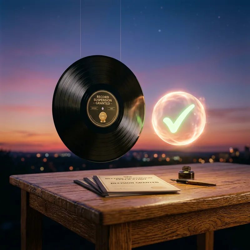 Illustrate an image symbolizing record suspension. Perhaps, a vinyl record hanging mid-air, suspended by invisible strings. Beside it, picture a checkmark hovering in a glowing orb of light. The background could be a gradient of twilight hues, adding an atmospheric effect. These two central elements are floating above a table with classic wooden texture. Key elements to depict include the glossy surface of the vinyl record, the radiance of the checkmark, the smooth texture of the wooden table, and the whimsical gradient of the twilight sky.