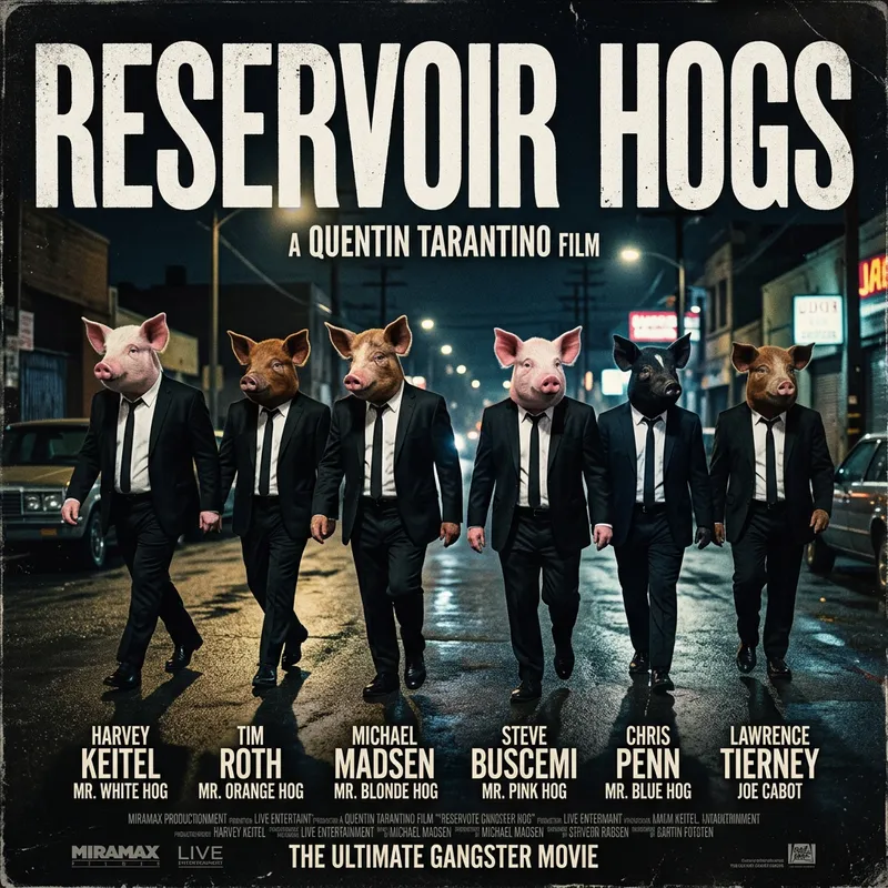 Recreate the original Reservoir Dogs movie poster but with pigs. Rename the movie Reservoir Hogs.