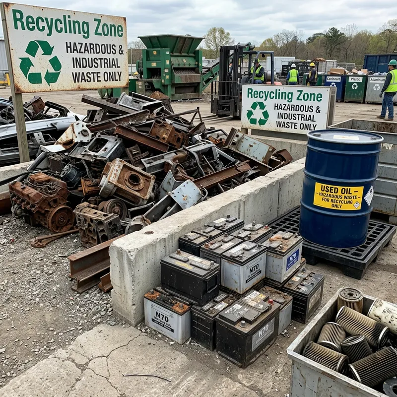 Recycling Waste with N70 Batteries, Filters, Scrap Metal & Used Oil