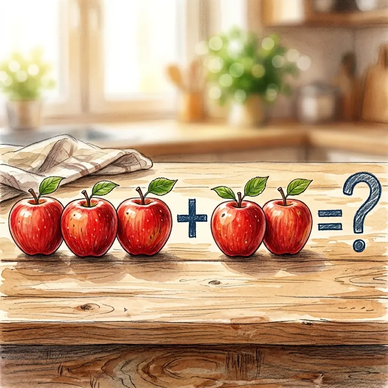Illustration of four ripe red apples placed side by side. A plus sign is drawn next to them, followed by three similar red apples, arranged in a row. After the seven apples, there is a question mark signaling the total sum to be figured out.