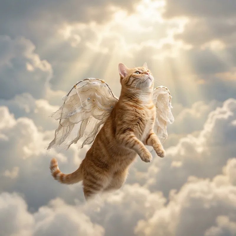 Photo of a red cat with angel wings adorned with gauze, ascending towards sainthood amidst the clouds.
