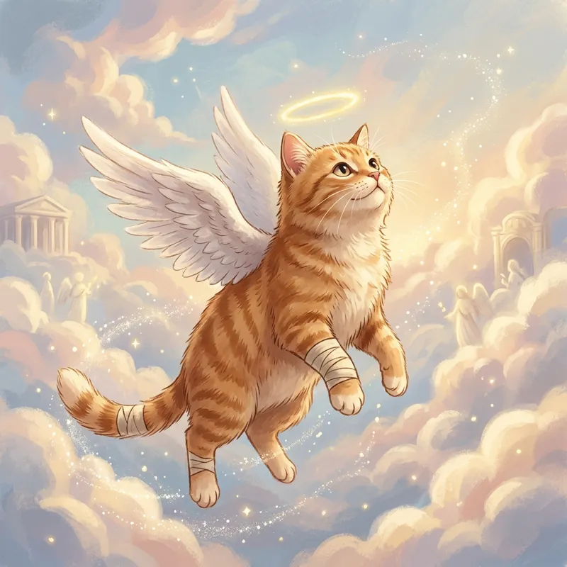 Red cat with angel wings and bandages, becoming a saint among the clouds