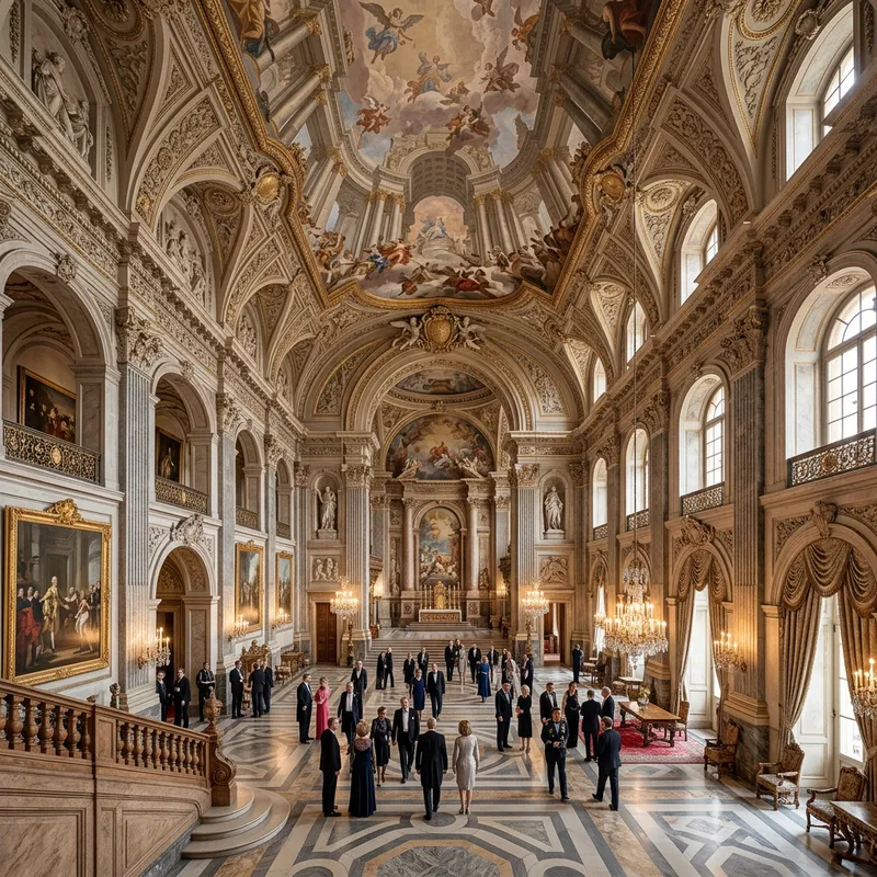 A grand interior of a prestigious embassy, designed in the style of baroque architecture. The image is captured with a wide-angle lens to show the full scope of the scene. The color palette is dominated by shades of light brown and gray, imbuing the setting with a regal atmosphere. The scene includes architectural details prevalent in baroque architecture such as intricate moldings, lavish ornaments, and forced perspective drawings that create an illusion of depth and grandeur.