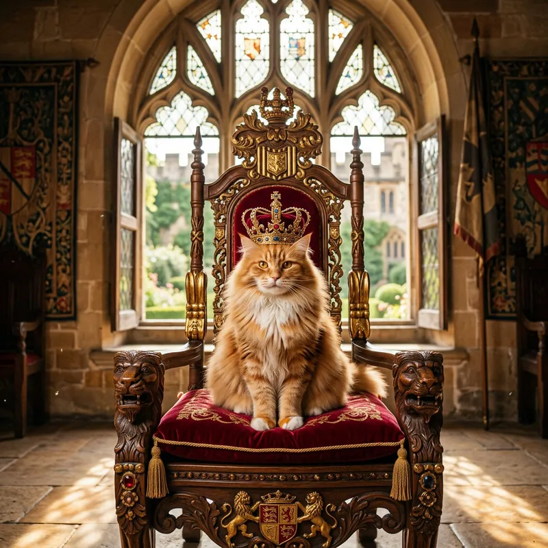 A regal fluffed up domestic cat sitting on a throne. It boasts a royal golden crown on its head. Dappled sunlight filters through a large ornate window behind the throne, casting a warm glow on the scenario.