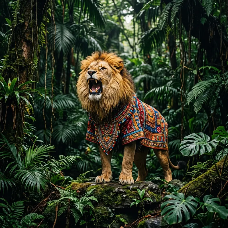A majestic lion with golden mane roaring mightily in the dense tropical jungle. He is adorned with a colorful, vibrant dress that stands out strikingly amidst the dark green foliage. The dress is decorated with intricate patterns of various shades and colors, giving him an air of regality. His roar rings out, echoing through the unseen depths of the jungle, symbolising the raw, untamed might of nature.