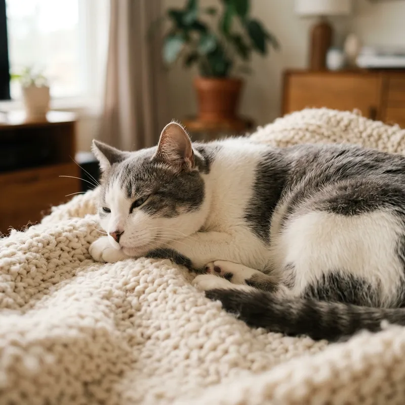 Serene White and Gray Domestic Cat on Soft Plush Blanket