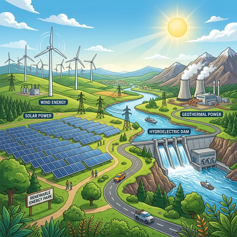 Showcase an illustration of various forms of renewable energy resources. Imagine a landscape which features wind turbines in the distance, their blades spinning with the gusts, harnessing the power of the wind. On the other hand, there is a large solar farm, its panels angled towards the radiant sun, capturing its energy. Nearby a river runs, with a hydroelectric dam built across it, using the water's force for power. Finally, in the background, there's a geothermal power plant, using the Earth's heat. The sky is a clear blue, with a few scattered clouds.