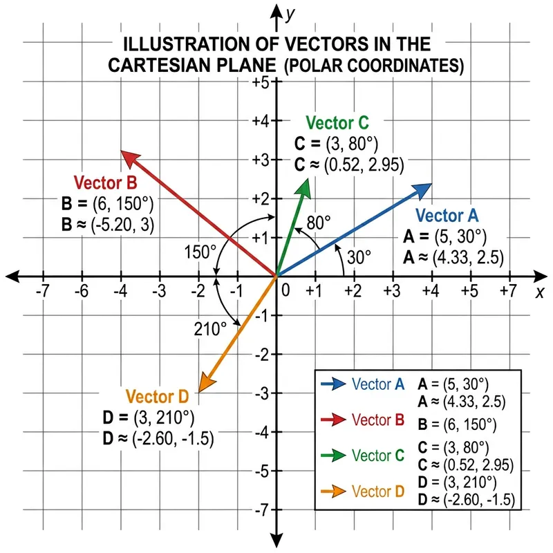 Illustrate the following vectors in a Cartesian plane, given in polar coordinates. Vector A with magnitude of 5 at an angle of 30 degrees. Vector B with magnitude of 6 at an angle of 150 degrees. Vector C with a magnitude of 3 at an angle of 80 degrees. Vector D with a magnitude of 3 at an angle of 210 degrees.