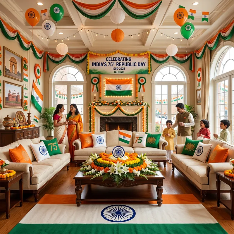 An interior design celebrating the 75th Republic Day. Imagine a grand living room with an elaborate decoration. The decorations feature the national colors in creative ways, with tasteful buntings, banners, and balloons adorning the ceiling and walls. The centerpiece of the room could be a large coffee table embellished with a floral arrangement inspired by the national flower. A striking yet elegant tricolored rug covers the floor, mirroring the national flag. There could also be tastefully decorated cushions on the sofa, in line with the theme. The atmosphere should reflect joy, pride, and a spirit of celebration.