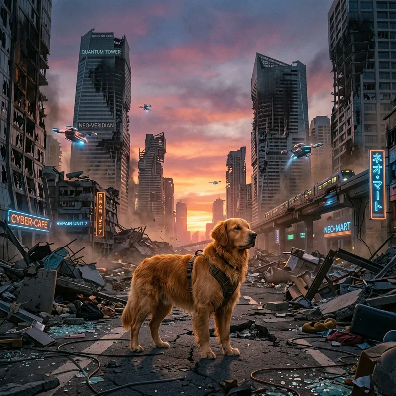 Resilient Golden Dog in Futuristic Cityscape After a Catastrophe