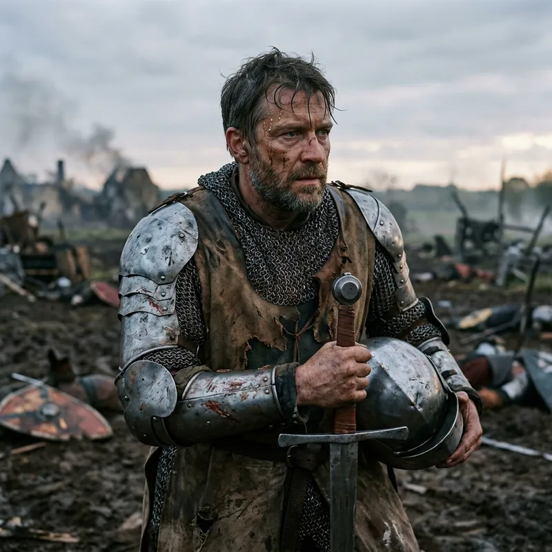 A knight who is carrying a sword, looking weary but refusing to surrender. He's clad in worn-out armor, with an expression of determination and resilience on his face. Sweat drips from his brow, hinting at the arduous battles he has fought. Despite his fatigue, his grip on the sword remains firm, reflecting his steadfast spirit and commitment to his duty.