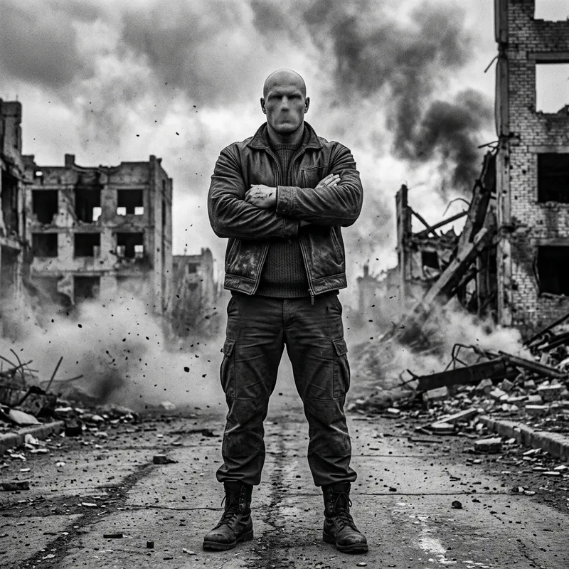 A brutal man with no hair and no face, potentially of Slavic descent, stands against the backdrop of an apocalyptic scene. The whole scene is styled in a striking black and white color scheme. He stands tall despite the chaos and ruin around him, symbolizing resilience and defiance. Amid the swirling winds and clouds of dust, skeletal remains of buildings can be seen, adding to the dystopian vibe. He radiates an aura of power and control, undeterred by the devastation that surrounds him.