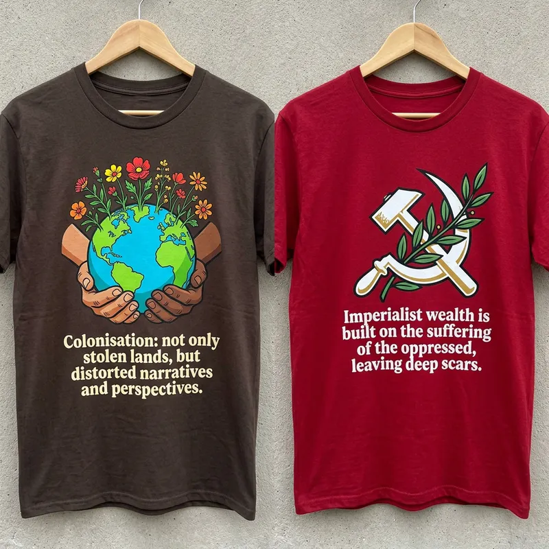 Envision two designs of t-shirts. For the first one, bright colors are accentuating the image of hands holding the Earth with flowers sprouting, all of which is set against a brown background. The message printed on the shirt reads, 'Colonisation: not only stolen lands, but distorted narratives and perspectives.' This design reflects the resistance of colonised peoples and the twisting of their histories and cultures by colonisers who appropriated not only their lands, but also tried to impose their own narratives and perspectives. The second t-shirt design features symbols of struggle, such as a hammer and sickle intertwined with olive branches, against a red background. The caption on this shirt states, 'Imperialist wealth is built on the suffering of the oppressed, leaving deep scars.' This shirt symbolises the exploitation of natural and human resources by colonial powers, whose pursuit of wealth and power left deep scars on colonised societies marked with injustices and inequality.