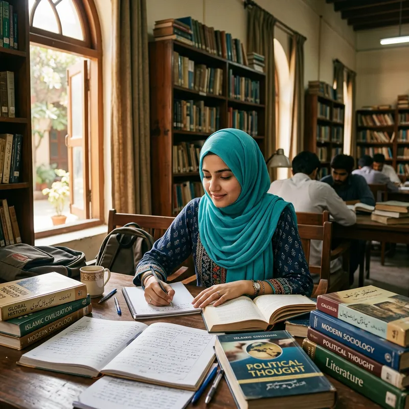 A graceful South Asian female student dressed in traditional attire, her hijab beautifully draped on her head, is engrossed in a significant scholarly pursuit. She's seated at a desk overflowing with textbooks, implying her dedication to education. Her eyes reflect determination and intelligence, and her face displays a kind and respectful demeanor. The soft yet vibrant colors of her hijab contrast with the rustic hues of the academic environment around her. The sunlight streaming through the nearby window paints an ethereal glow on her, emphasizing her stature as a devoted learner.