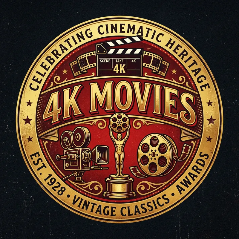 Design a circular retro-inspired logo for a company called '4K Movies'. The design should incorporate a film camera, a trophy, a film reel, and a clapperboard. The primary colors of the design should be vivacious red and glamorous golden. The overall feel should be one of nostalgia and celebration of cinematic heritage.