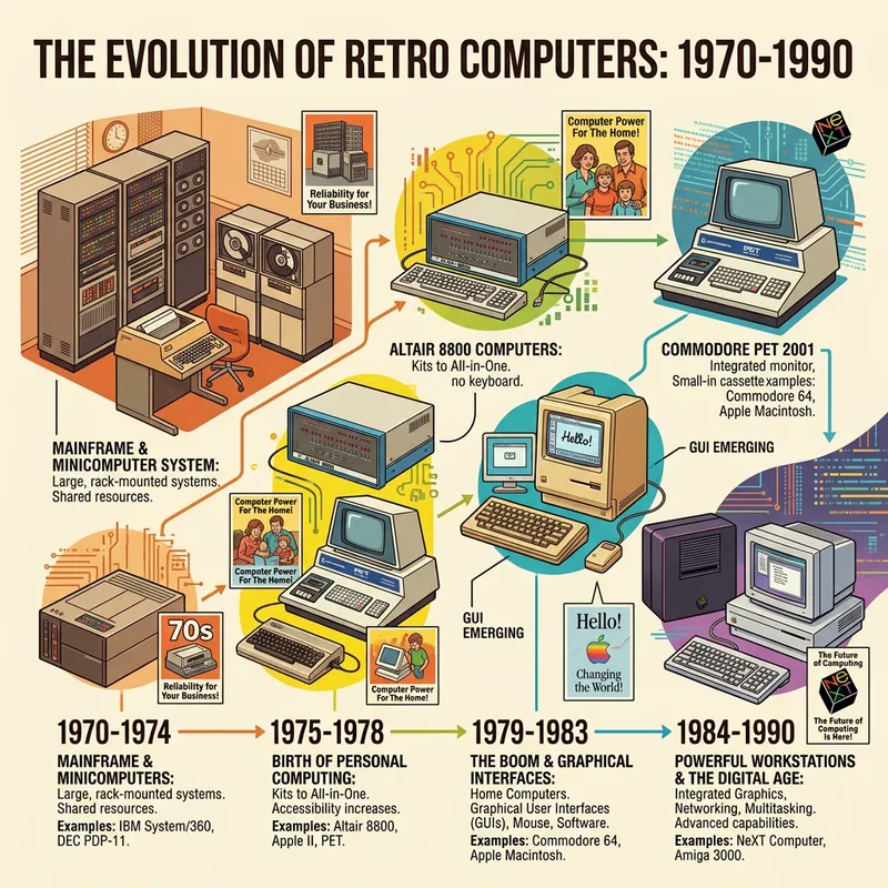 An informative illustration showcasing the evolution of retro computers from the year 1970 to 1990. Begin with an image of a large, clunky computer system from the 70s, typically found in office or scientific settings. Move through the timeline depicting transformations like the advent of the first personal computer, the shift to more compact designs, the emergence of 'all-in-one' designs with integrated monitors. Simultaneously, also include the general aesthetic elements of each era such as color choices, popular fonts, and advertising styles. Conclude with a depiction of a compact, workstation-style computer from the late 80s, capturing the spirit and trends of the emerging digital age.