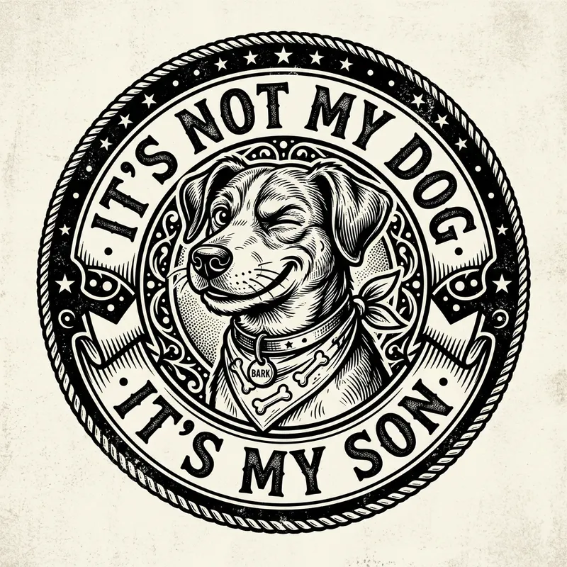 Retro monochrome T-shirt illustration in a circular composition. A cocky dog winking with a smirk in vector format. The words 'it's not my dog' and 'it's my son' curve at the top and bottom, both in bold vintage type. The illustration replicates the layout of a classic beer label or rock band patch. Detailed lines, thick outlines, and high contrast.