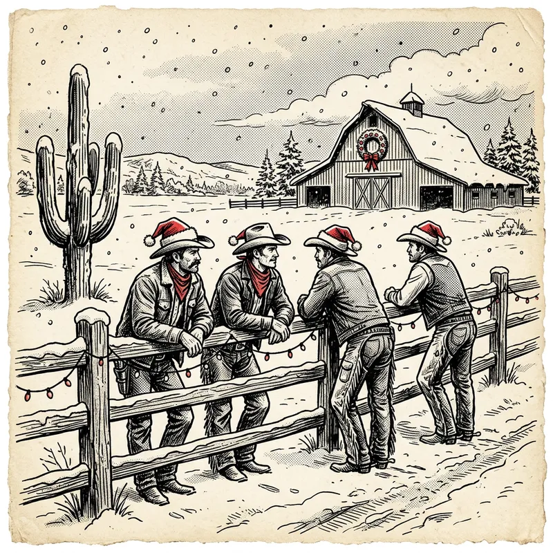 retro vintage western illustration of four cowboys leaning on a wooden fence, looking at a barn in the distance, snowy christmas landscape, holiday decorations, cowboy hats with santa hat trims, string lights on the fence, snow-covered cactus, christmas wreath on barn door, falling snow, thick clean ink lines, 1960s vintage drawing style, hand-drawn look, black and white with subtle red accents, textured paper background, high detail, 300 dpi.