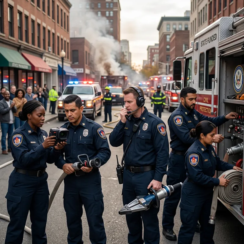 Visualize the transformation of civil protection with a constitutional recognition style of firefighters and state funding. Depict a varied group of firemen and firewomen of different origins such as Caucasian, Hispanic, Black, Middle-Eastern, South Asian performing their duty. Show them in uniforms symbolizing constitutional recognition, equipped with state-of-the-art tools financed by the state. The environment could be a bustling city with the flames mitigated by their efforts, reinforcing their vital role in civil protection.