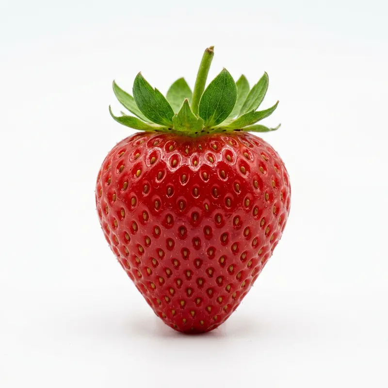 A ripe, juicy strawberry against a pure white background. The strawberry is red with small yellow seeds spread evenly across its surface, and a green stem at the top, which adds a vibrant contrast to the pure red of the fruit.