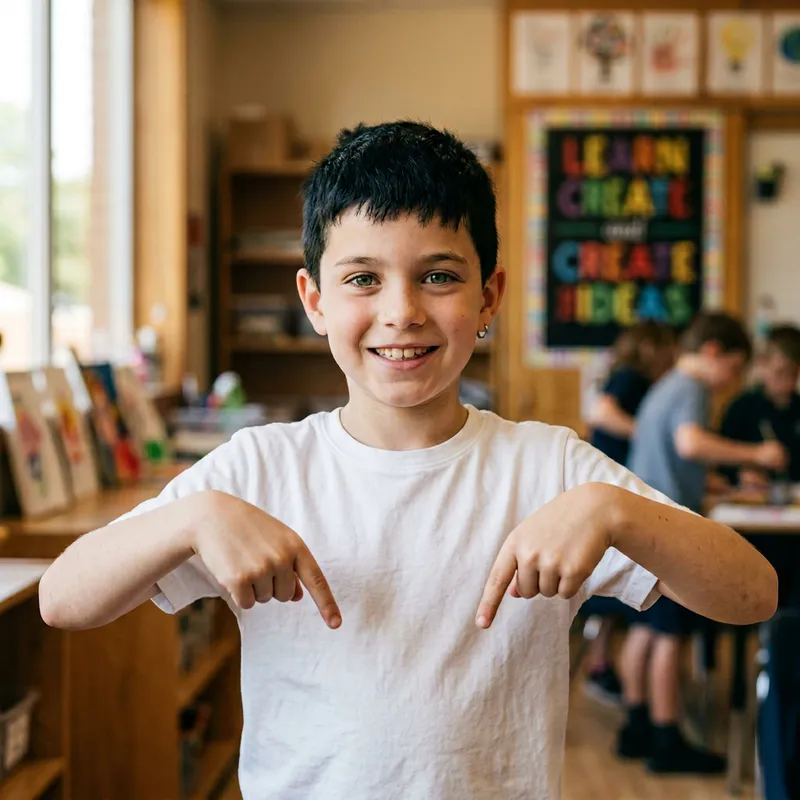 Realistic photographic portrait of a smiling boy, framed at half-length in an indoor setting with warm, natural lighting. He looks directly at the camera with a friendly, professional smile. He has short black hair, green eyes, and an earring in his left ear. He points down with both his left and right middle fingers as if to emphasize an important concept. He wears a white short-sleeve crew neck t-shirt. The background is blurred with a visible poster in the back. The style is photographic, sharp, like a professional shot.