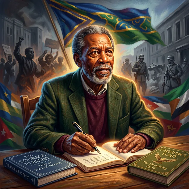 An inspiring figure, symbolizing enlightenment, holding a pen in his hand with scenes of historical brutality depicted in the background. Incorporate elements from two books, symbolizing political courage and love for freedom, such as book covers. Surround the figure with symbols of distinct cultural identity, such as a flag waving proudly in the background. Create a digital painting with rich textures and vibrant colors, showcasing the figure as a revered hero. Pay attention to facial expressions and body language to convey his determination and passion. Use a fusion of digital painting and luminescent airbrush techniques to bring depth and luminosity to the artwork.