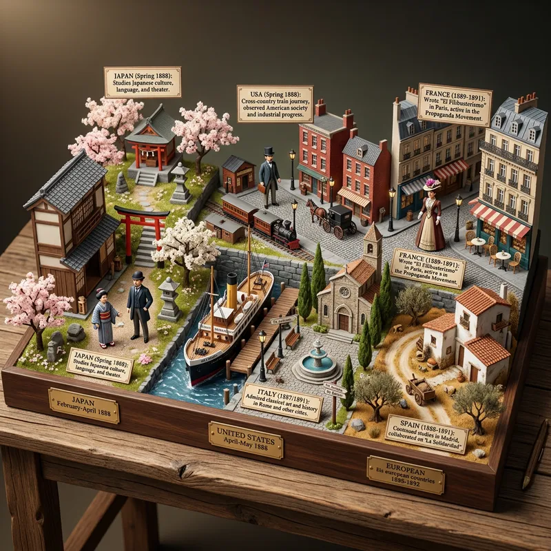 Create a detailed diorama showcasing different aspects of Rizal's second journey abroad which covers Japan, the US and assorted European countries. In the Japanese section, depict traditional Japanese architecture, cherry blossom trees, and a figure in historical Japanese clothing, symbolizing Rizal's interest in Japanese culture. In the US part, illustrate the historic city infrastructure, a figure sporting an 1800s American outfit, and a ship at the harbor showing his mode of transportation. For the European portion of the diorama, portray elements from different European cultures like a quaint Italian piazza, a figure in French period clothing and the earthy tone of Spanish countrysides. Infuse informative elements which has details about dates and important events.