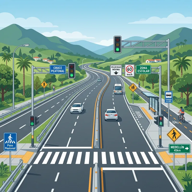 A scene representing road safety infrastructure in Colombia, illustrated with a minimalist design. Imagine a clean, open highway, lined with traffic lights, road signs, pedestrian crossings, reflective street markers, and barriers for guidance. The infrastructure shows a high level of organization and safety measures. The setting is a bright, sunny day with a clear blue sky. Neatly planted trees line the sideways while in the distance, rolling green hills hint at the diverse terrain of Colombia. All elements are drawn in a simple, modern style, highlighting geometric shapes and muted color tones.
