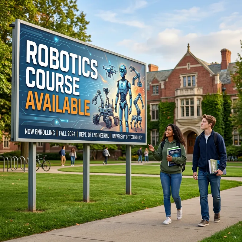 Illustrate an image of a large billboard displaying an announcement for a Robotics course. The main elements should include the text 'Robotics Course Available' in bold, futuristic font style. Beside the text, present a series of autonomous machines, varying from humanoid forms to wheeled robots, artistically rendered to capture the viewer's attention. Please place this scene in an academic setting, with lush green lawns and revealing part of a red brick campus building in the background, bathed in afternoon sun. A couple of diverse students - a South Asian female and a Caucasian male - should be seen walking towards the billboard with interest, textbooks in hands.
