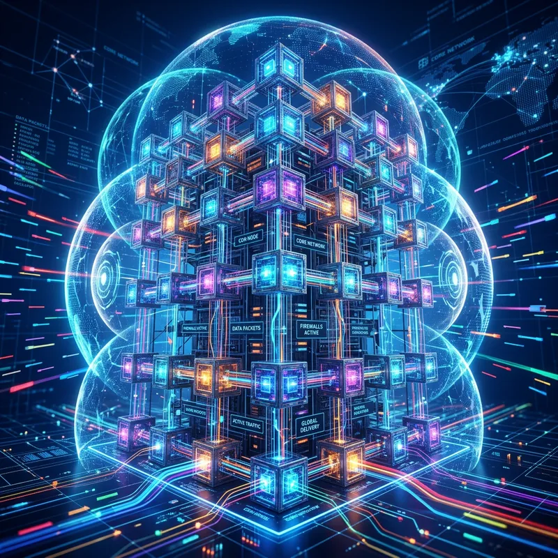 A large, robust Content Delivery Network (CDN) node represented as a towering structure of interconnected cubes. Each cube is brightly illuminated, denoting active data transfer, against a deep blue, digital background. Layers of security firewalls are depicted as glowing, spherical shields encompassing the entire CDN structure. Visible packets of data, symbolized by glowing streaks, are depicted traveling through a web of connections between the cubes. The network is diverse in terms of volumes and types of data being transferred, indicated by the varying sizes and colors of the data packets.