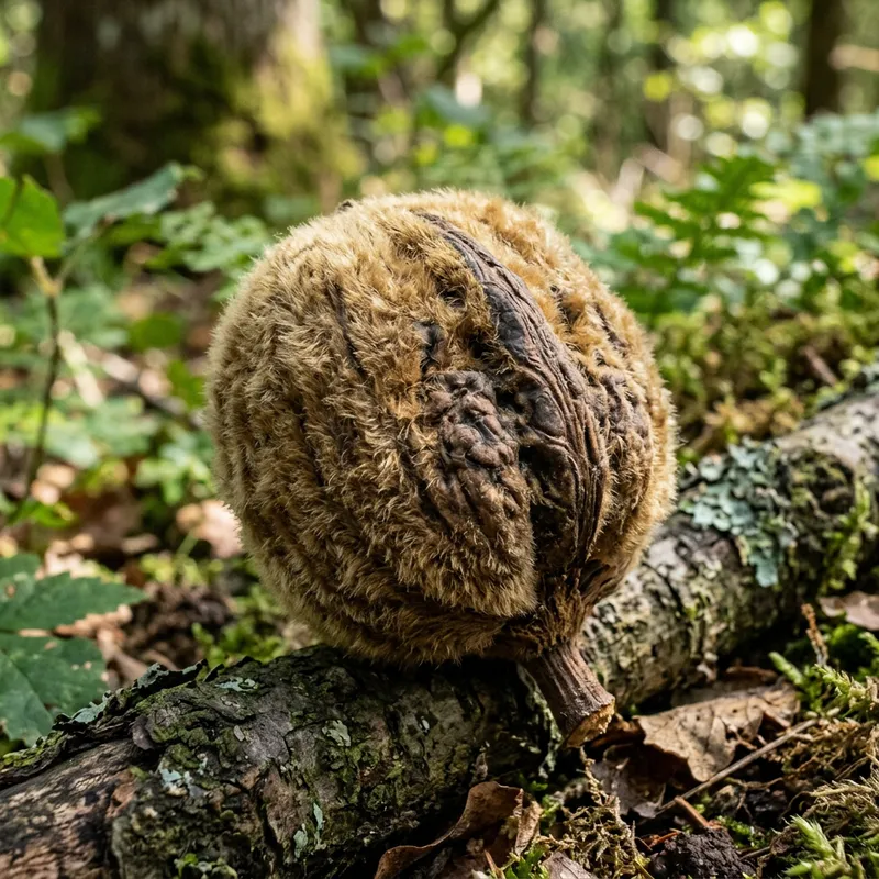 A fluffy, sturdy nut, perhaps a hazelnut or walnut, with a detailed texture that exhibits signs of toughness, strength, and resilience. It should convey its robustness while also emphasizing its cuddly and fuzzy appearance.