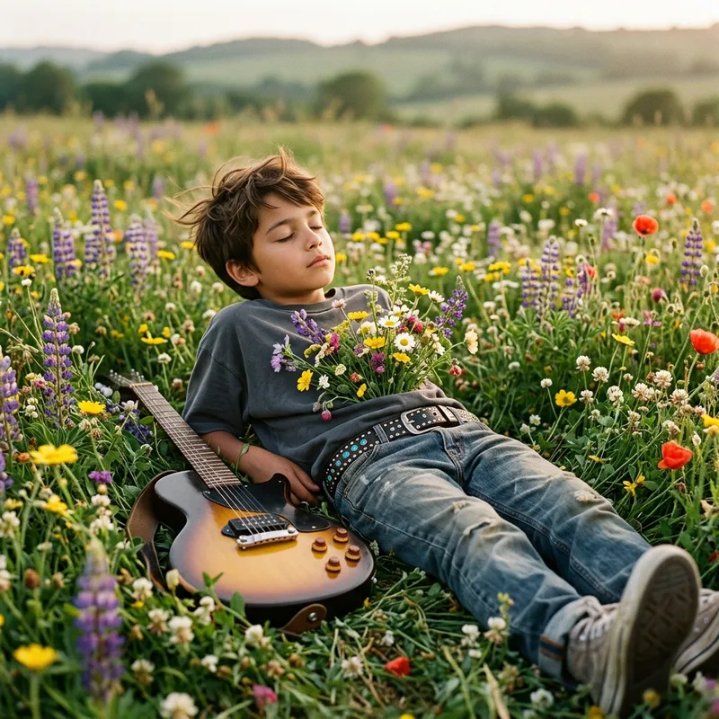 A young, miniature rock musician of unspecified descent lies in a field of blooming flowers. He carries a guitar, symbolizing the essence of his musical passion. From his chest, flowers of different types vividly bloom, making it seem like his spirit is fuelling their growth. His short brown hair rustles in the breeze and his closed eyes portray a sense of deep tranquility. The musician's attire further emphasizes his profession and includes a bejeweled belt, and a loose-fit shirt. The entire scene bathes in a soft, natural light.