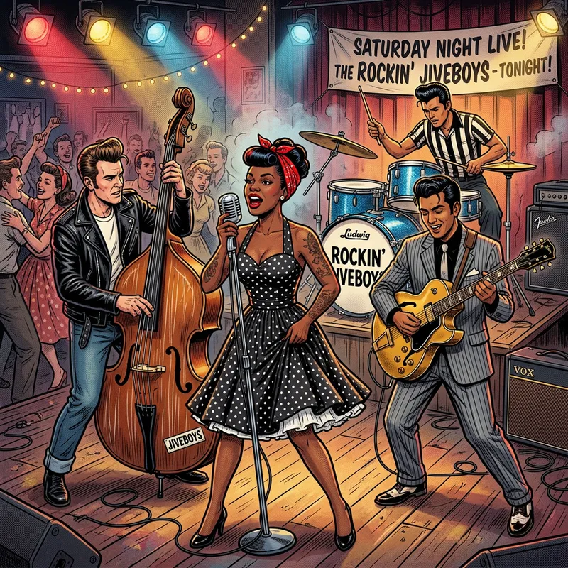 A detailed illustration of a rockabilly band, highlighting the unique fashion and era-specific details. The band, bathed in the glow of stage lights, is composed of four individuals: a drummer, a guitarist, a double-bassist, and an energetic female singer taking center stage. The singer, an African American female, is dressed in a classic 50s style polka-dot dress, her hair styled in a bandana up-do. The Caucasian male double-bassist plucks at the strings of his towering instrument, dressed in a leather jacket and cuffed jeans. A Hispanic male drummer is seen in the background, beating rhythmically to the music. Lastly, a South Asian male guitarist, dressed in a zoot suit, strums vivaciously at his electric guitar.