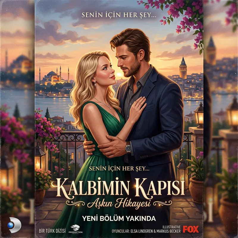 Create a digital painting themed after a Turkish TV show. The poster should be in the style of a romantic drama series, similar to the sentiment of 'Knock on My Door'. The main characters are a blonde woman and a brown-haired man, both of European descent.