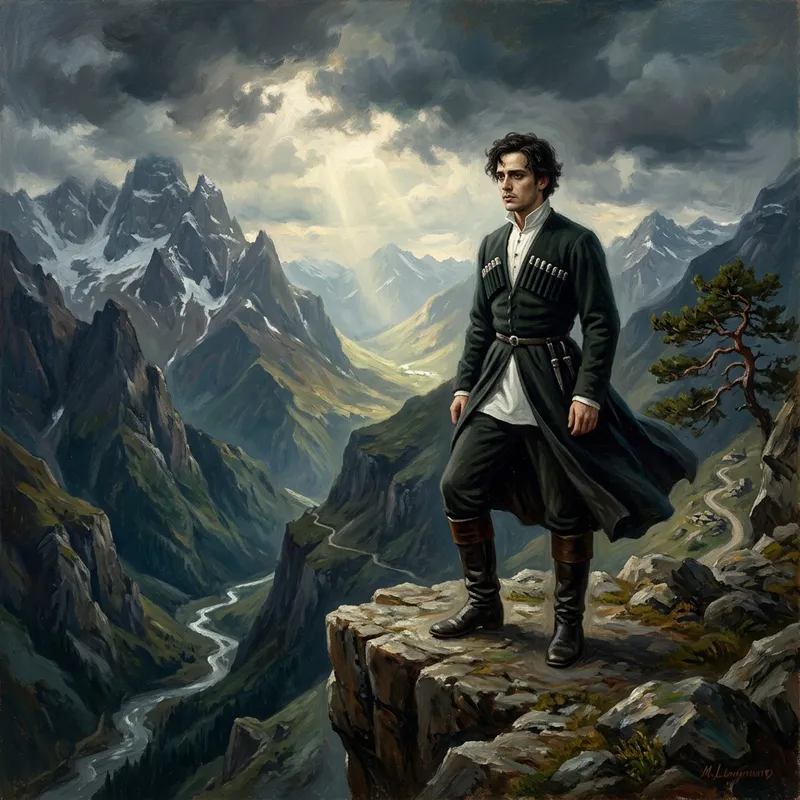 Create a romantic and dramatic image inspired by the literary works of Mikhail Lermontov, a 19th century Russian poet and novelist. The scene should be set in a rugged mountain landscape with a single heroic figure, defined by his introspective demeanor and poetic soul. He's wearing period-appropriate attire and standing near a precipice, gazing out at the wild nature around him