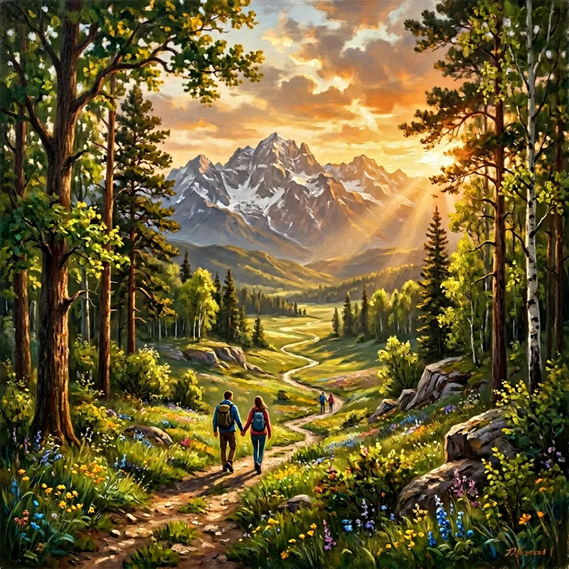 Create a realistic oil painting portraying a scene in the late afternoon during spring time. This artwork should depict two lovers hiking. The individuals should be holding hands while crossing a valley at a distance. Bordering their path, there should be tall trees. In the far horizon, high mountains should loom. Use volumetric lighting to enhance the mood and depth of the scene, making the trees, the wood and the valley come alive under the warm glow of the setting sun.