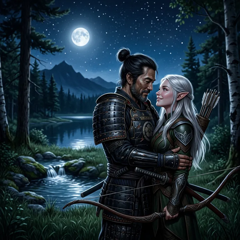 A romantic scene unfolds under a starry sky, bathed in moonlight. A forty-year-old courageous samurai of Japanese descent, his garb bearing signs of many battles fought, lovingly embraces a stunning high elf archer who has fair, ethereal beauty. She possesses long, vibrant hair that glints in the moonlight and expertly crafted elven bow at her side. Their eyes meet, a silent conversation of deep affection and passion transpiring between them. They find themselves in a serene, woodland setting with a bubbling spring nearby and a quaint lake. The outline of towering mountains loom in the distant backdrop, completing the enchanting panorama.