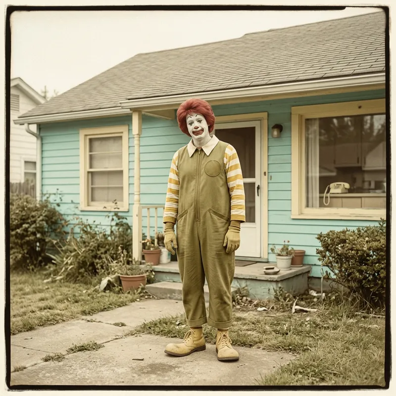 Ronald McDonald in front of a house, in the style of light turquoise and light yellow, post-'70s ego generation, calotype, alex hirsch, mommy's on-the-phonecore, full body, olive cotton