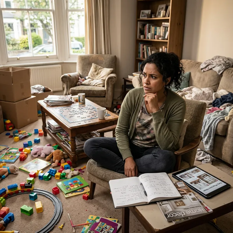 A woman of undefined descent is sitting in a cluttered room, her brows furrowed in deep thought. She is contemplating how to transform the space into a warm, inviting play area for her children. Strewn all around her are various toys, books, and furniture. Despite the disorder, she is determined to create a cozy, kid-friendly environment. The challenge is evident in her eyes as her gaze sweeps over the room, considering possibilities, yet the solution eludes her.