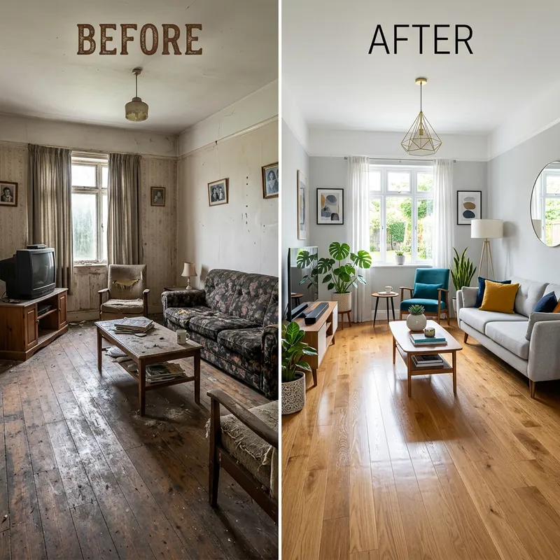 Create an image showing the interior of a room before and after reconstruction. Begin with a view of the room filled with worn-out furniture, faded paint on the walls, and creaky wooden floor. Everything looks old and in need of repair. Then, provide a contrasting image of the same room after being restructured and renovated. The new image should feature modern, stylish furniture, brightly painted walls, a gleaming hardwood floor, and trendy light fixtures. Include other minor details like houseplants and artwork on the walls to add personality to the room.