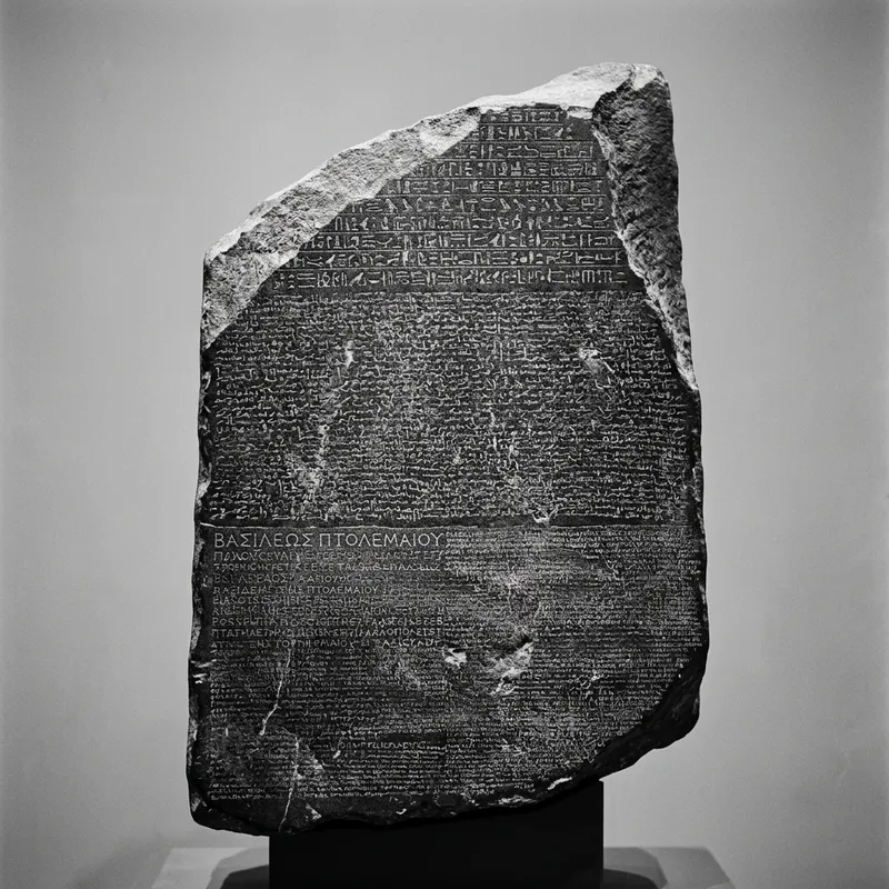 Illustrate an image of an ancient artifact - the Rosetta Stone. It should look like a large stone slab with inscriptions in multiple languages, including hieroglyphics, Demotic script, and ancient Greek. The stone is broken into irregular pieces, with the majority of its surface covered with nicely carvings of ancient text. It is in grayscale tones depicting its age. Around the stone, the background is blank, drawing attention more on this significant historical artifact.