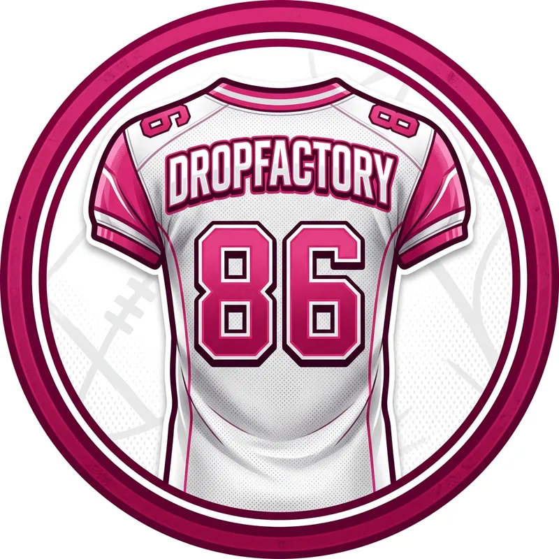 Create a round logo suitable for a profile picture featuring a football jersey. The jersey should be emblazoned with the name 'dropfactory' and bear the player number '86'. The jersey colors should be a mix of pink and white.