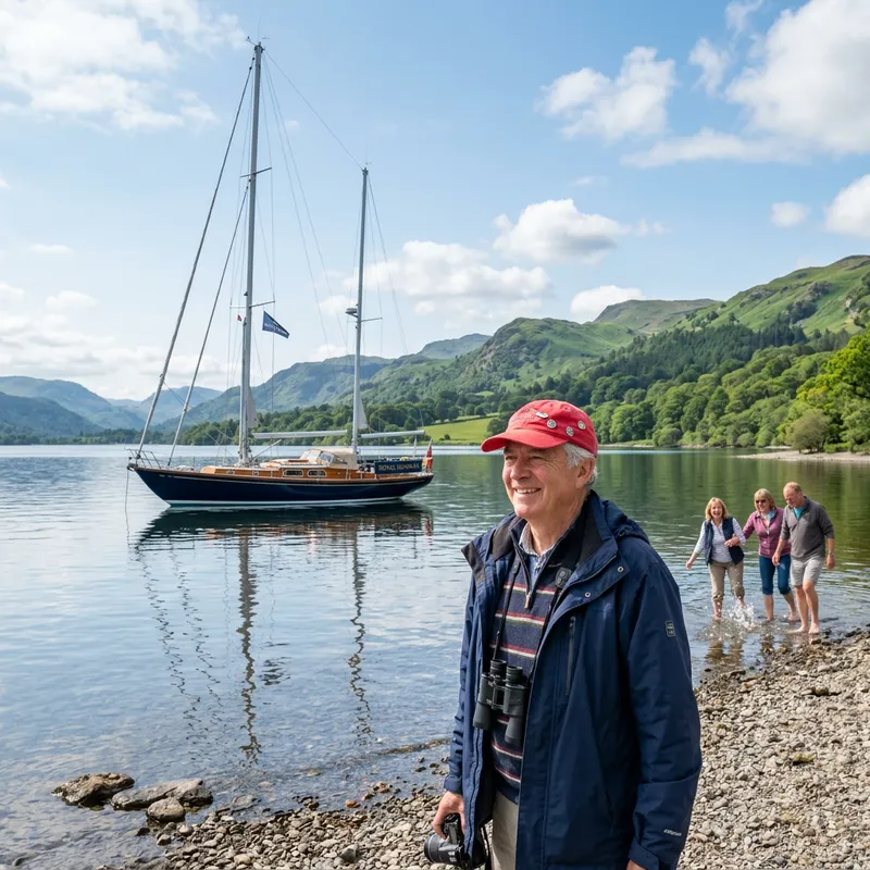 A tourist donning a red fishing cap stands on the shoreline, visibly pleased with his seafaring adventure. An elegant sailboat, labelled 'Royal Huisman', sways gently a short distance away from the coast. It presents a striking image with its towering masts and polished hull, reflecting in the crystal clear water of Windermere. The tourist's companions frolic nearby, taking delight in the coastal scenery; their festive mood indicates a successful boating trip. The sailboat stands as a handsome spectacle, easily taking claim as one of the most alluring you'd ever lay your eyes on.