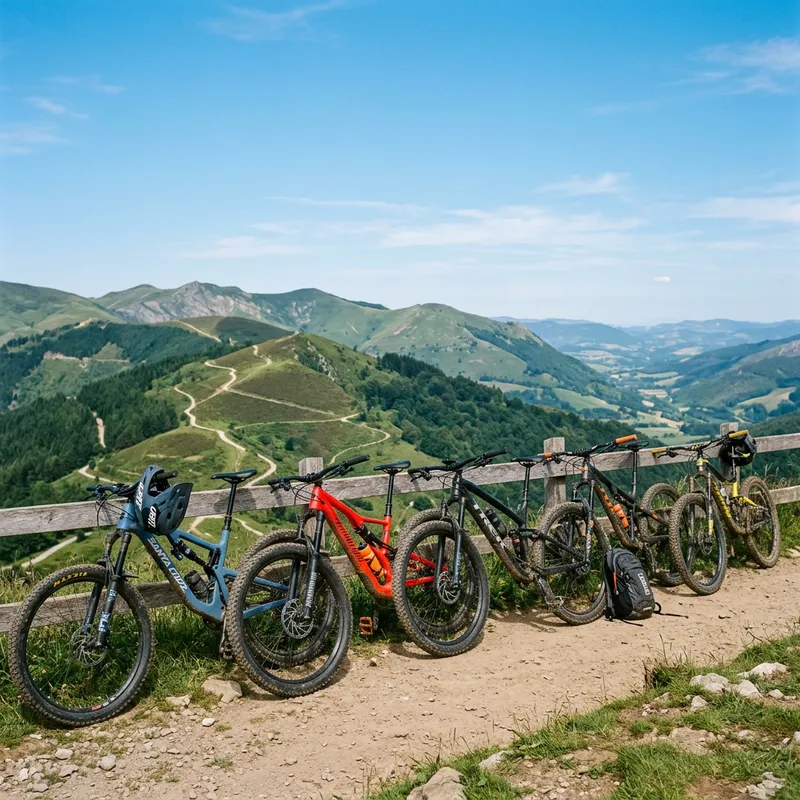 An image showing multiple BTT (mountain) bicycles. The bikes are resting against a beautiful backdrop of a hilly landscape with a clear, blue sky overhead. Each bicycle is intricately detailed, showing the nuances of their rugged design suited for mountain biking. They come in a variety of colors, including blue, red, and black, highlighting their individual features, like sturdy frames, knobby tires, and efficient disc brakes.