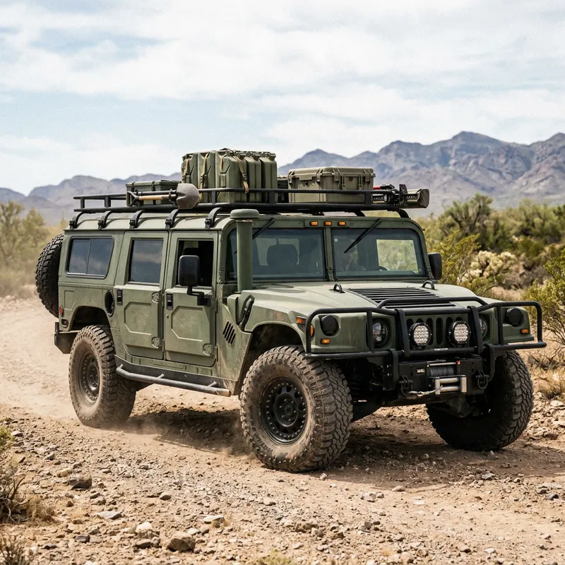 A rugged Hammer H1 van featuring off-road wheels equipped for field operations in a military context. The vehicle's body exhibits a robust design, and its tires are reinforced and broad to adapt to different terrains, manifesting the characteristics of a military convoy. It shows an image of resilience and vigorous strength.