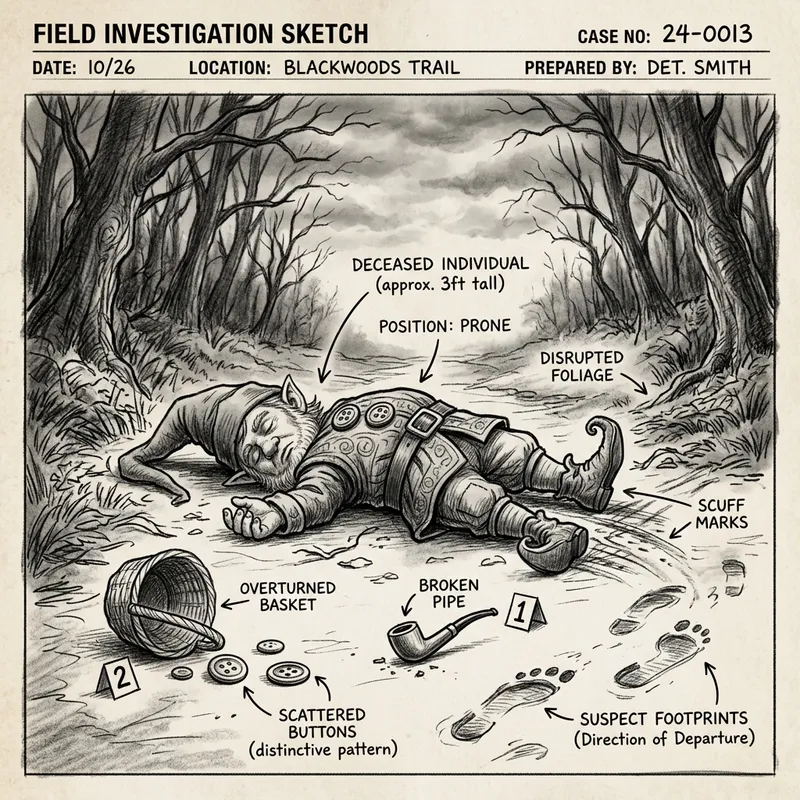 A detailed, monochrome crime scene sketch akin to those found in investigative reports, depicting an unfortunate individual akin to a fictional character from fairy tales. Recognizable by his small stature, pointed hat, and distinctive eccentric clothing typically associated with fantasy characters, the individual is found lifeless outdoors. Strewn around the character's body, are characteristic tell-tale signs of an incident. Include traces of peculiar objects, disrupted foliage and footprint remnants, contributing to a dramatic scene set against a rural backdrop with sky and trees. The mood of the scene is somber, sobering, and full of mystery.